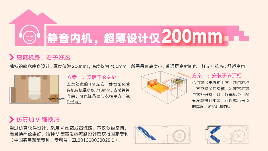 采用“V”型換熱器,開機初期,根據(jù)室內(nèi)溫度與設(shè)定溫度自動調(diào)節(jié)至高頻狀態(tài),縮短制冷或制熱時間,提升舒適度